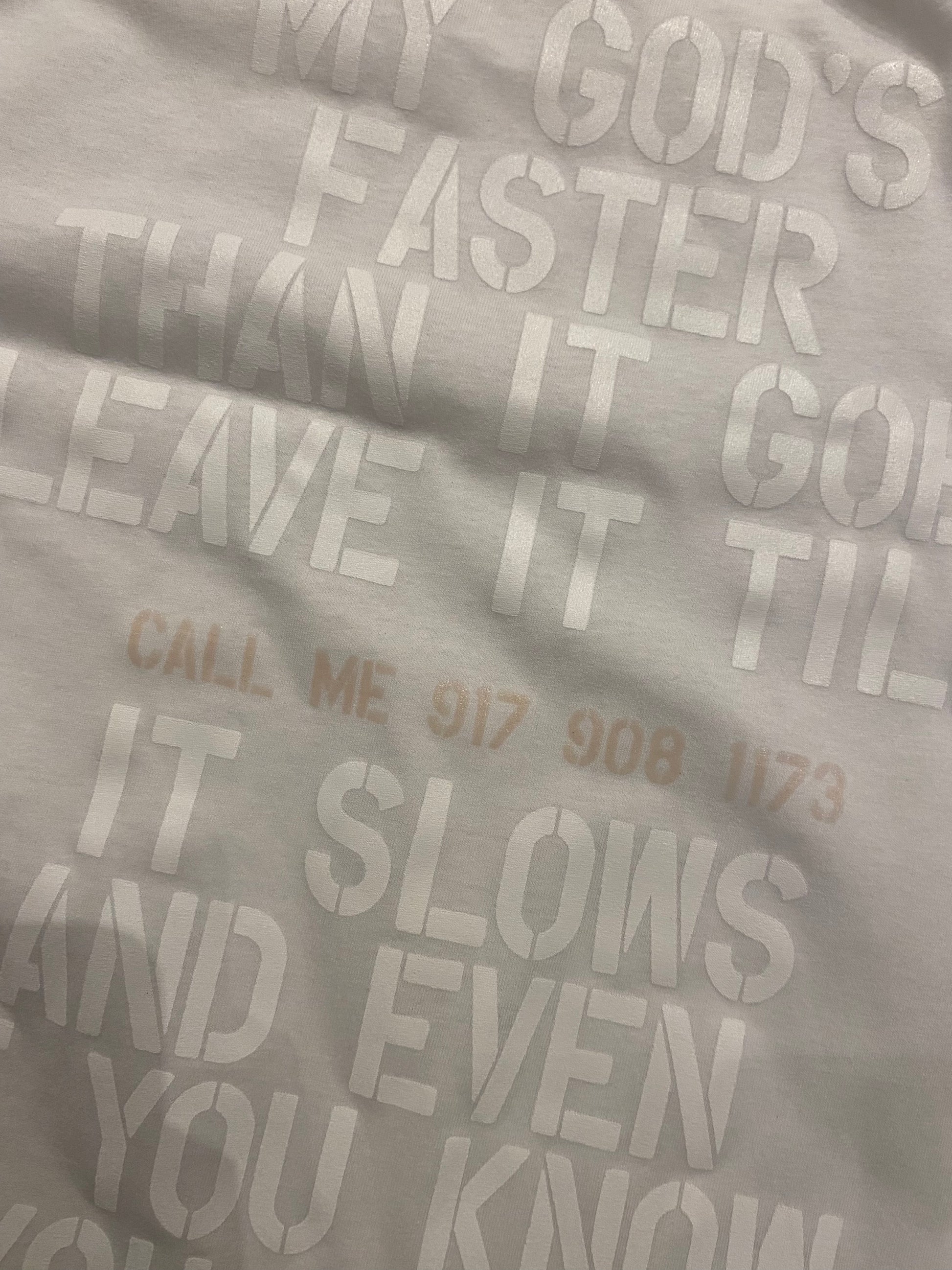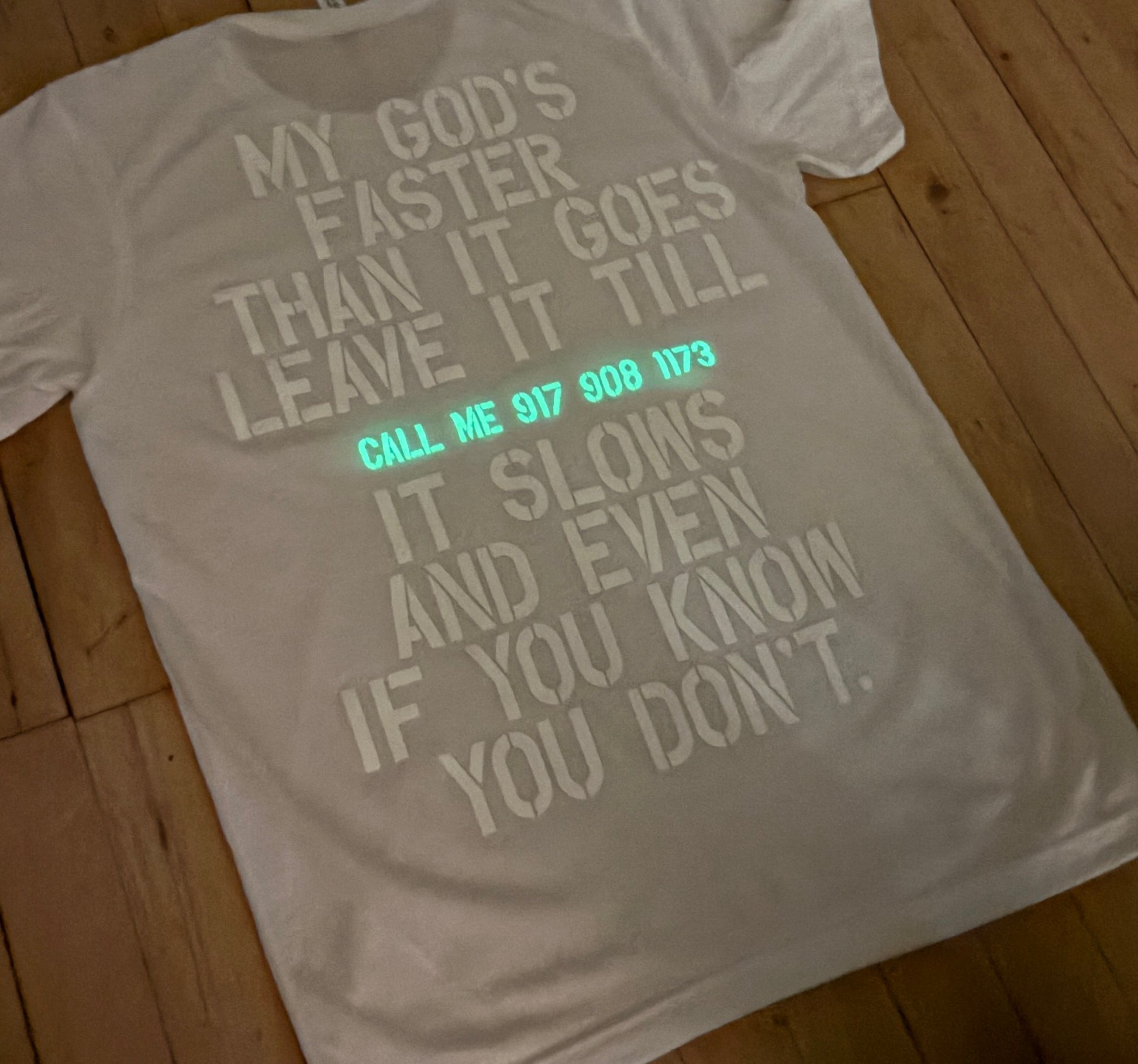 Semi-Sheer, Very Soft! Tee with Silkscreen Front, Back + Interior Print, with white, shimmer-texture, and glow and the dark ink.